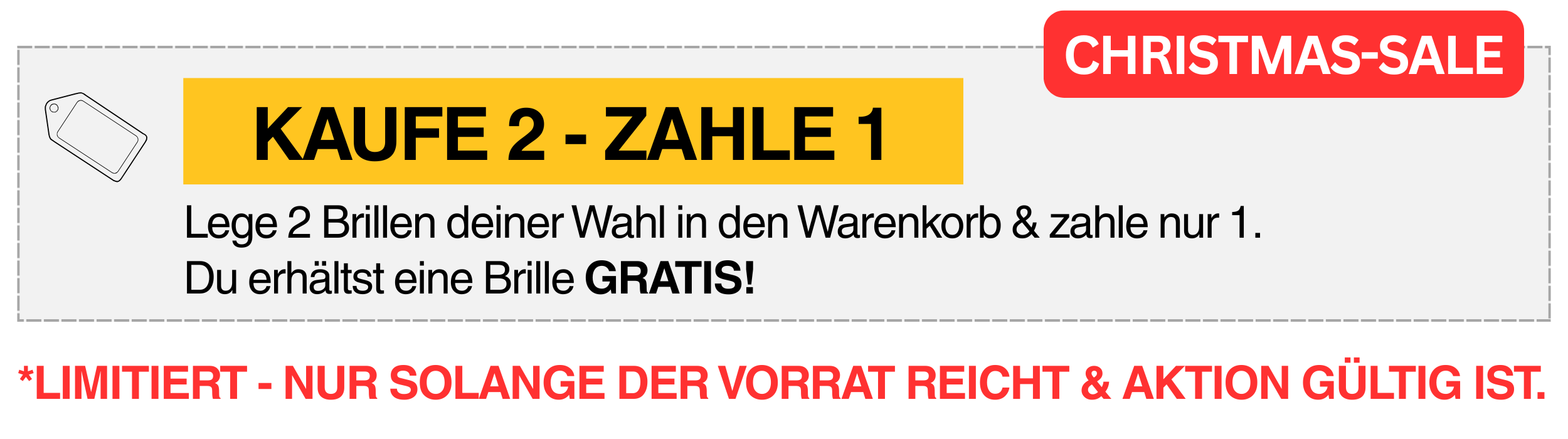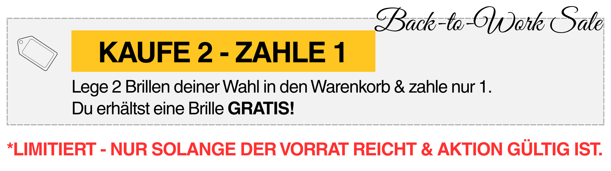 Lege 2 Brillen deiner Wahl in den Warenkorb & zahle nur für 1 Brille. Der Rabatt wird automatisch berechnet.